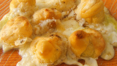 Fill the little “choux” with the green pistachio cream.Spread a thin layer of Sauce Mornay on the bottom of a baking pan. Lay the filled choux on top. Sprinkle flaked or grated truffle on them then cover with the remaining sauce. Bake in a pre-heated oven until the surface is golden.