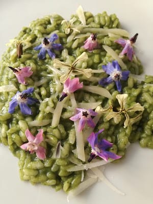 Start with extra virgin olive oil and onion. Toast the rice, deglaze it. Add the chopped grass. Start the braising with a ladle of the cooking water of this grass. Don’t use only this water, the taste would be too grassy and too strong. Keep next to you a boiling pot of vegetal broth.