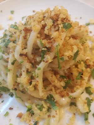 A special note it’s deserved to the Pici, the typical pasta – long irregular spaghetti – from the country side of Siena. Traditionally made with tender wheat flour ( and not with semolina), their texture is “pasty”. The most natural contiment is with salty anchovies and garlic ( to improve the taste) and crispy fried bread crumbs ( to improve the complex texture).