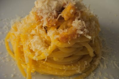 In the “Spaghetti alla Carbonara”, the hot pasta must be quickly tossed into slightly beaten egg yolks, so that the egg yolks go to coat the entire lenght of the spaghetti.