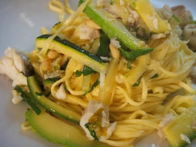 The delicate and thin “Tagliolini” go with a delicate sauce: in the photo: sea bass, zucchini and pine nuts.