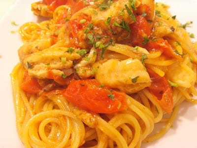 The “Trabaccolara” is a condiment from Viareggio, in Tuscany. The pasta is not previously boiled, but cooked directly into a fish sauce ( that must be liquid). The spaghetti must be, of course, thin.