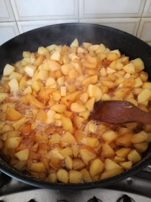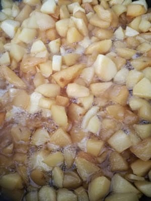 Add about 30% of their weigh of sugar and let cook on low heat for….hours, stirring occasionally.
