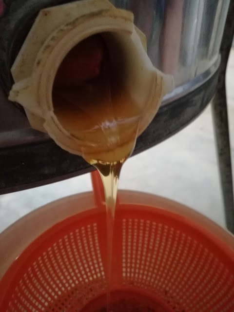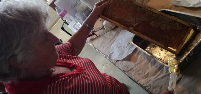 The entire family takes care of it: cranking……scraping…..sifting….. collecting and canning.