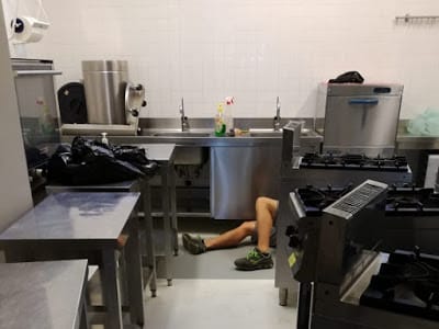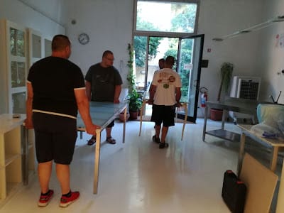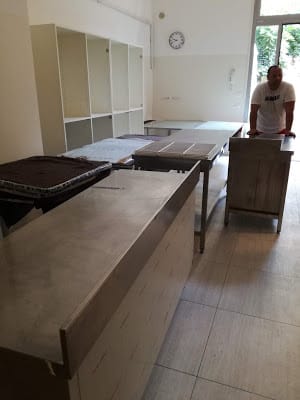 23 agosto: i lavori di ripristino vanno avanti. Torna l’idraulico a riallacciare acqua e gas. Marta trapana il muro del bagno per riattaccare la scatola del pronto soccorso. Portiamo giù scatole, laviamo bicchieri, riempiamo vetrine e mobili d’acciaio.