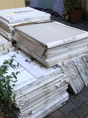 A luglio sono state scelte le mattonelle. Sono state accatastate fuori, nel cortiletto e per fortuna i vicini non hanno brontolato. Li ringrazio per aver sopportato per un mese un andirivieni di operai, polvere e rumore.