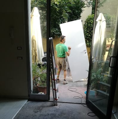 L’idraulico stacca il gas e i gli acquai. Arrivano anche i falegnami a staccare tutte le porte, che devono essere accorciate.