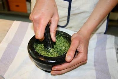 With the mortar, start with a few grains of coarse salt, “cream” a little garlic clove, then start to add the leaves of basil – previously washed and dried – pressing them against the stripped walls of the mortar with the pestle, until they release their essential oil and become a sauce. Then press the pine nuts in the green sauce. Finally add grated Pecorino and Parmigiano Reggiano and extra virgin olive oil ( the oil should be not strong in taste).