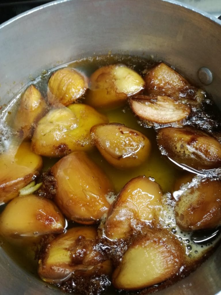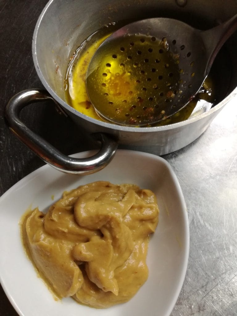 I immersed the cloves in oil in a small pan and cooked for 8 hours at 70 ° C, until the cloves became very soft, slightly browned and being careful not to fry the oil. The temperature is decisive to avoid overheating and decomposition of the oil. however, a slight foam will form, which is not due to the “frying” of the oil, but rather from releasing water from the aglione.