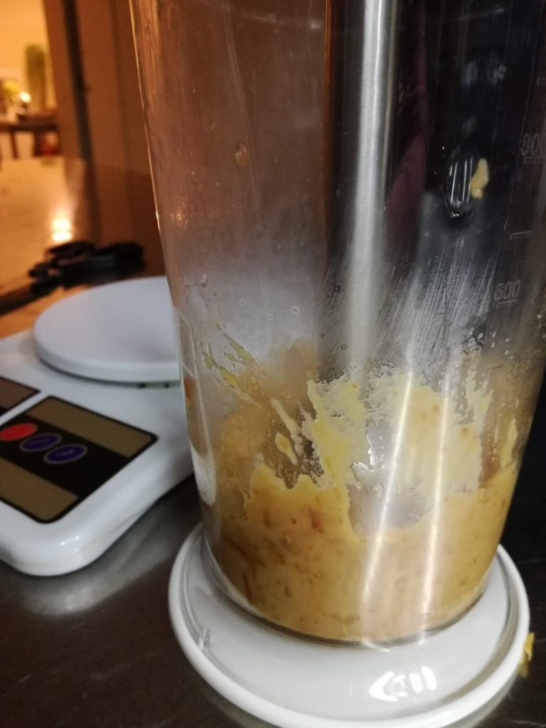 I took the wedges with a slotted spoon to drain them and put them in the immersion blender. I added a gram of salt and started the engine.