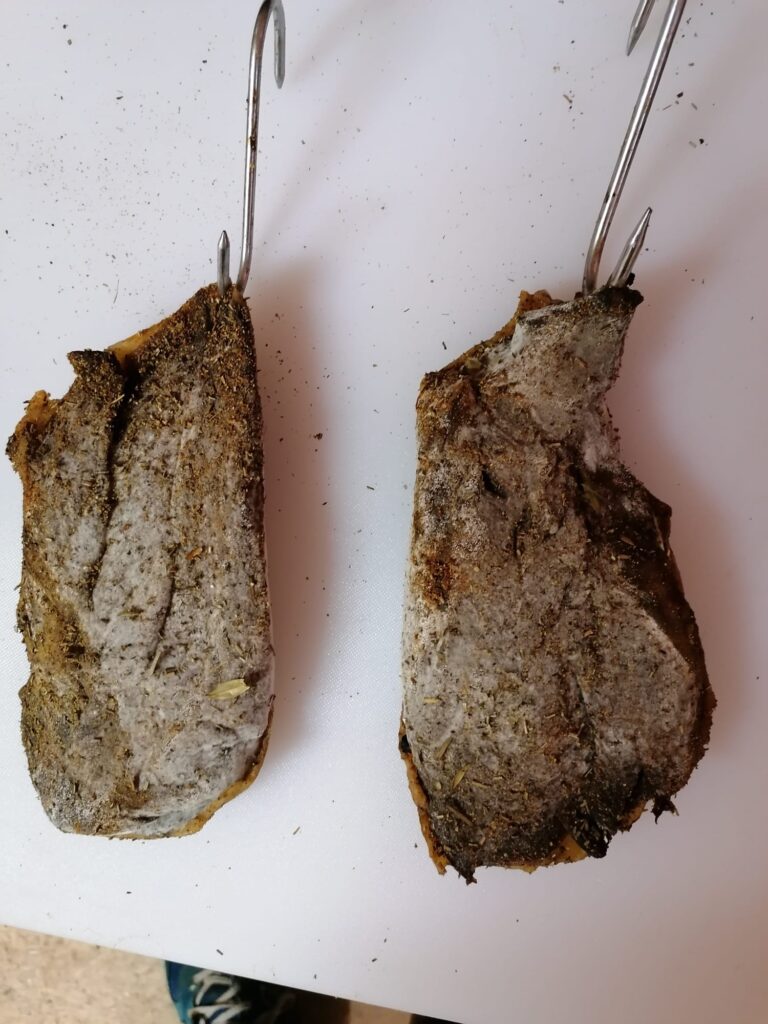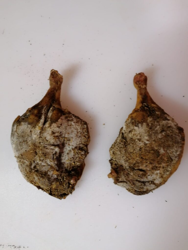 The thighs are washed in a basin of wine and dried with a cloth. The thighs, but also the breasts, so prepared, are hung and … you wait.