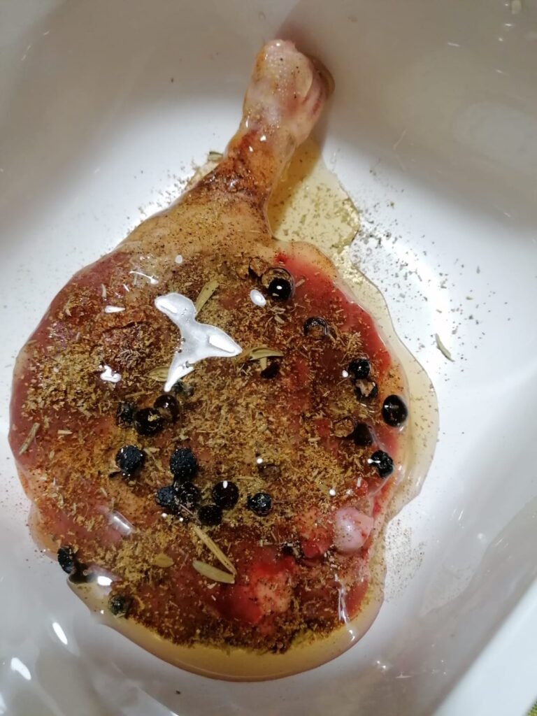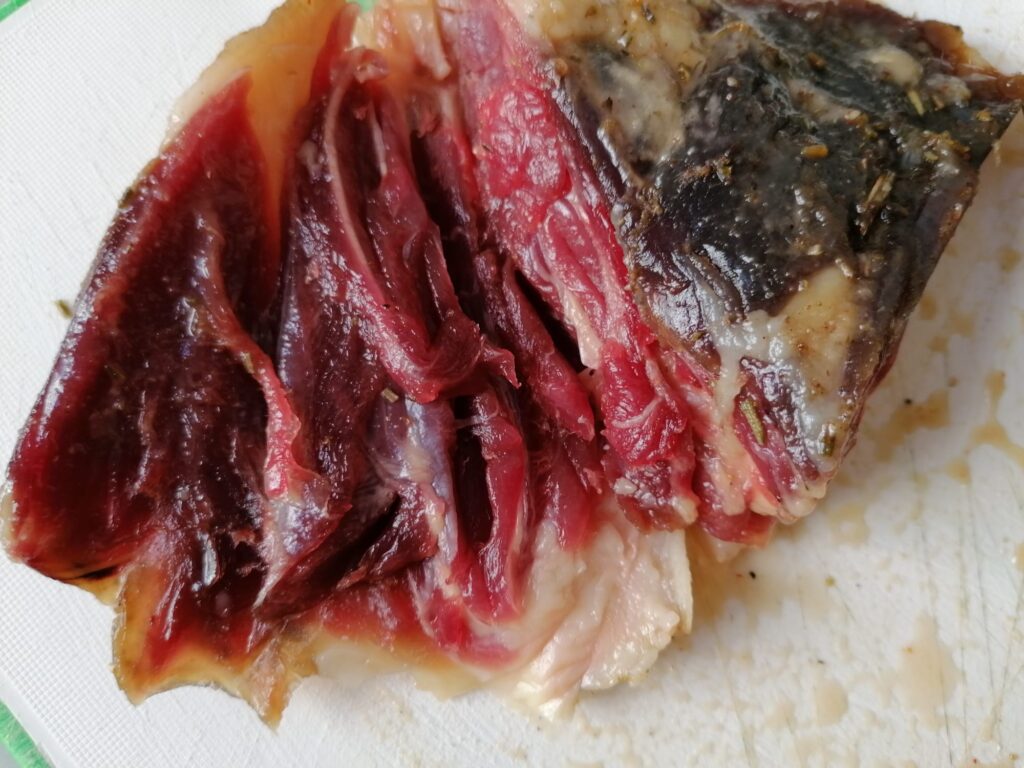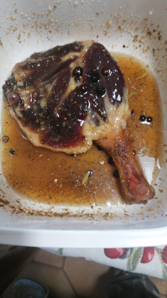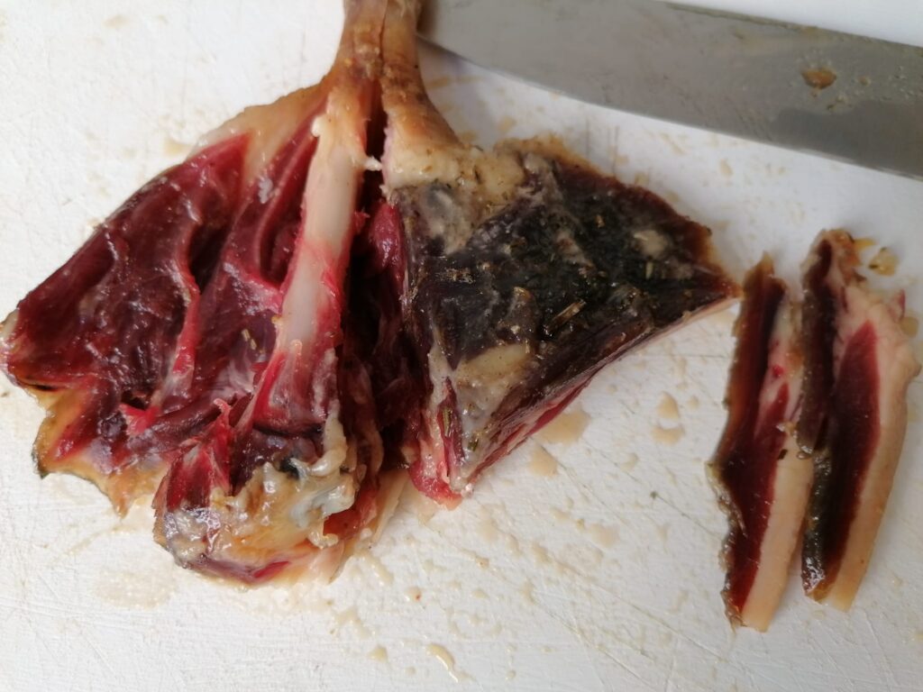 .It’s been 15 days. Today, March 12, 2021, I bone it and I slice it. The meat is red, it looks raw. But there are no hints of rancid, martial, rot. The meat is healthy and firm. The aroma that is released is that of honey, when cut the meat is a little hard. Certainly a little is due to the animal, very free-range, but also to the pulp of the thigh, full of filaments and tendons