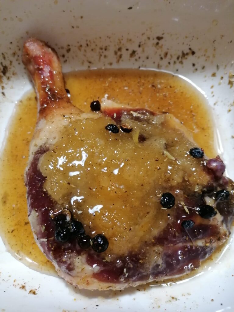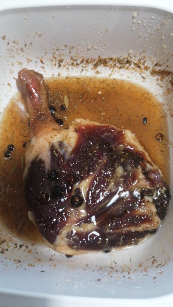 In the photo above is what the duck leg looked like after three days of infusion in honey, without salt. The flesh is already beginning to darken.