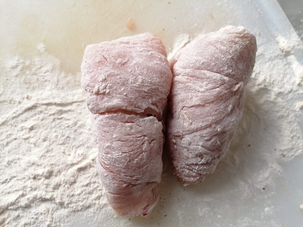 Butterfly the chicken breast; cut them in order to get 8 slices. Pound them, between two sheets of baking paper.