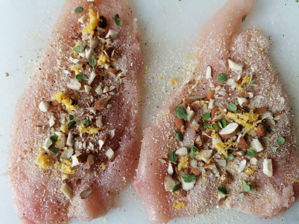 Season each slice of chicken with salt and pepper. Scrape 8 sprigs of marjoram and distribute the leaves on them. Sprinkle ½ tbs of bread crumbs and ¼ tbs of chopped almonds on them. Distribute also the grated zest.