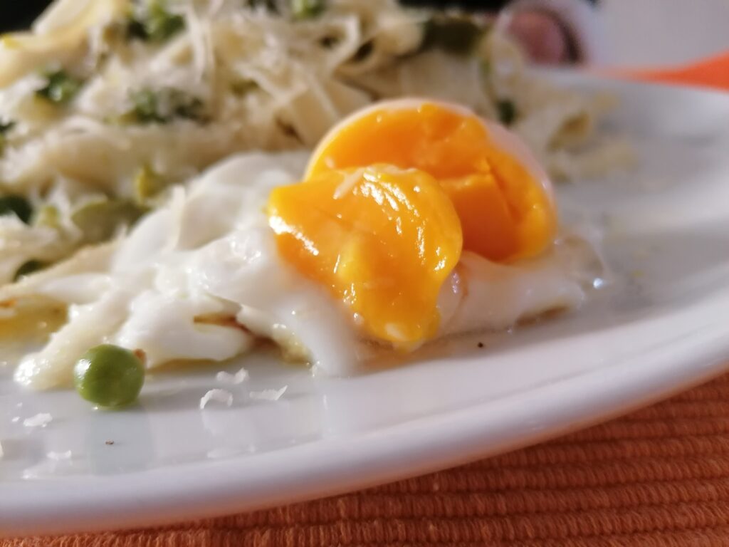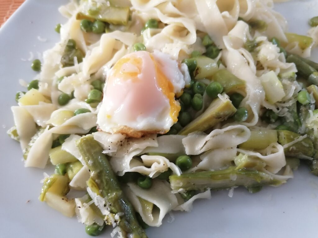We decided to make it a “piece of furniture” to a plate of water-based pasta tagliatelle, dressed with a rustic sauce of asparagus and peas. The yolk was placed on the plate of pasta and then spread on it.