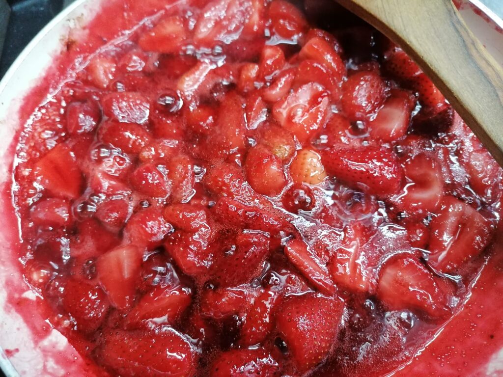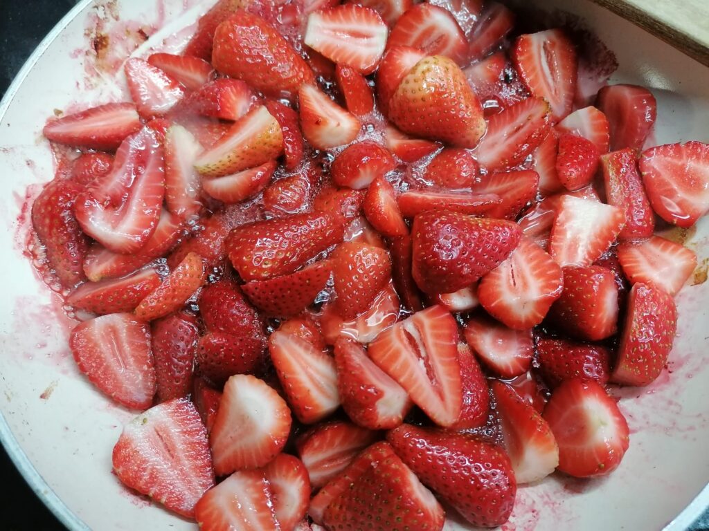 Put sugar and strawberries in a skillet and cook on medium heat.