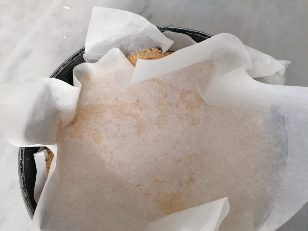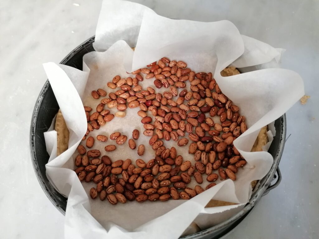 Place the other piece of baking paper upon, spread some dry beans to not allow it to rise during the cooking. Bake in a pre-heated oven at 180° c – 350 F, for 12 minutes.