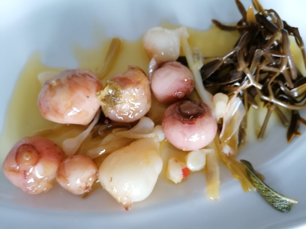 The Giglio aperitif is wild: “lampascioni”, “crazy garlic”, wild leek, sea fennel: all strictly spontaneous, cooked in vinegar obtained from Ansonico del Giglio wine and preserved in good Giglio extra virgin olive oil