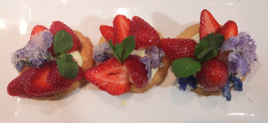 I simply placed them on shortcrust cakes with custard and strawberries.