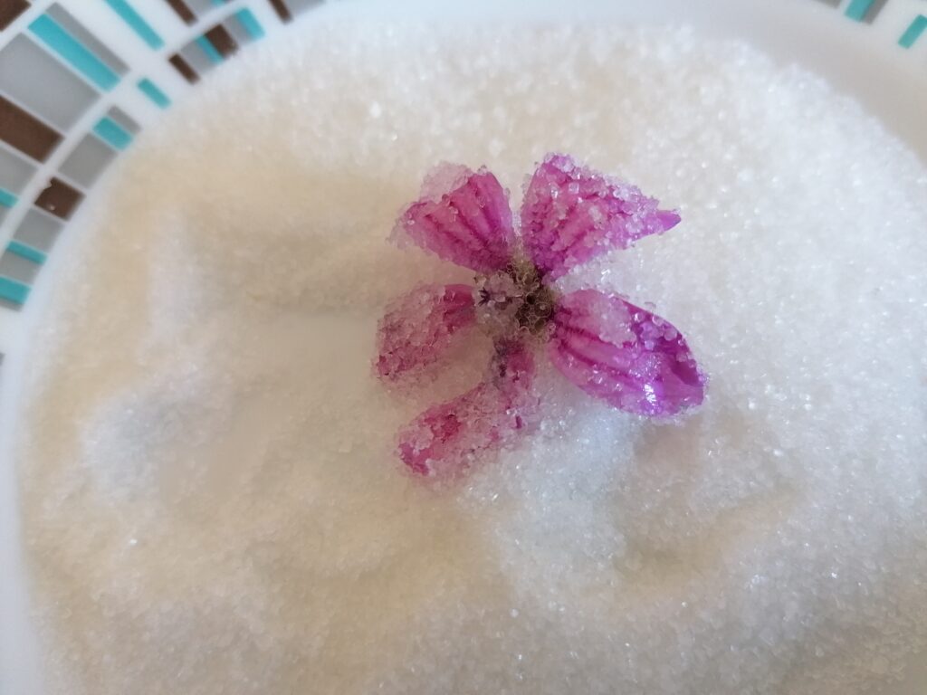 You have to wet the flowers, without soaking them too much, with the help of tweezers. Then you have to pass them in granulated sugar. Very delicately, even more so than in the first operation. The sugar weighs them down and the petals bend and lose their shape.