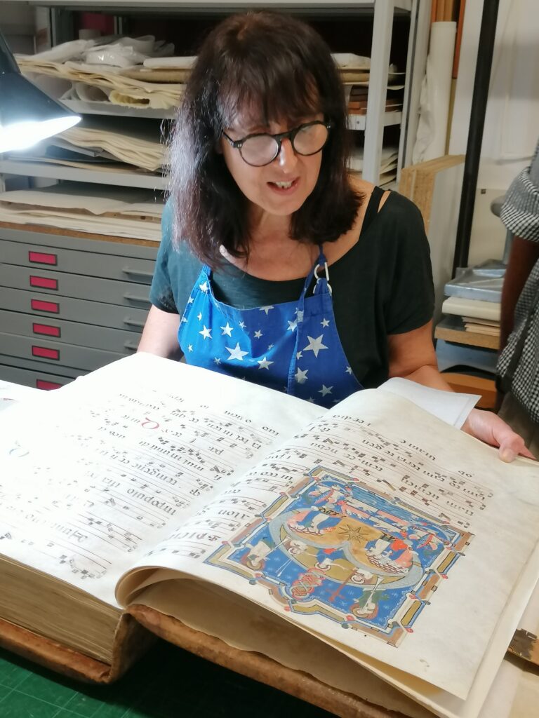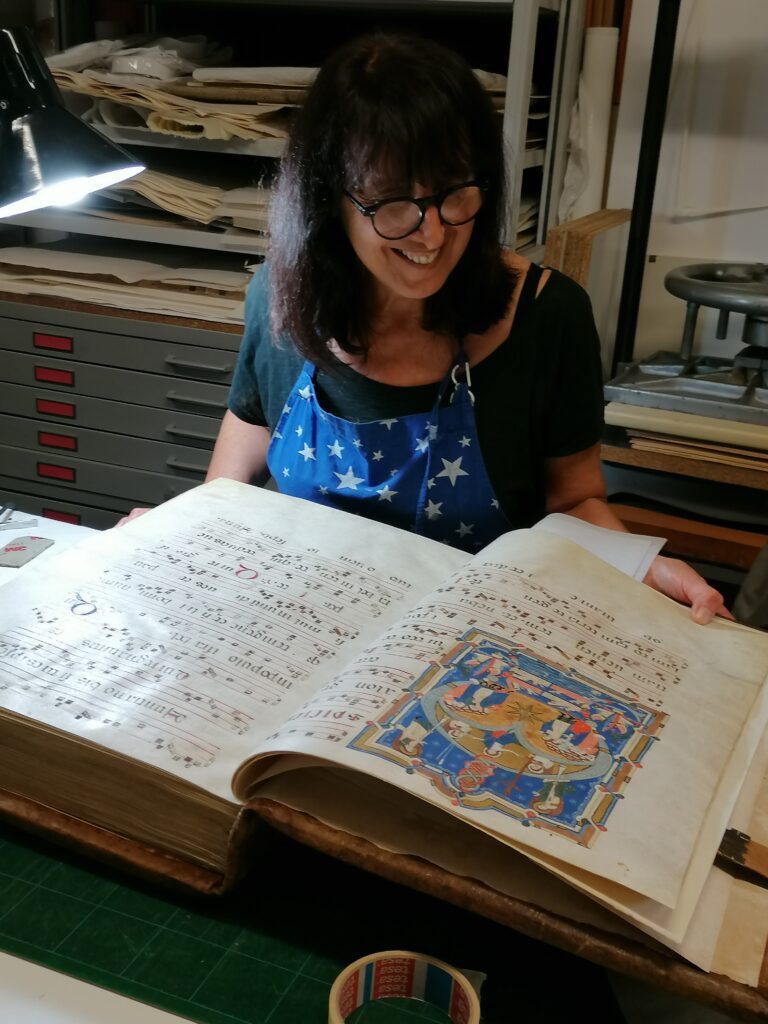 These books are from 1200 and Simonetta is their restorer: beauty, art, culture, passion and patience. Simonetta does a unique and precious job, she is one of the few who knows how to do it and who is allowed to do it. She happens to go to the caveau (vaults ) of historical museums and libraries and to do her painstaking work with the escort of armed guards. Then she passes on her knowledge to someone who is as passionate as she is.