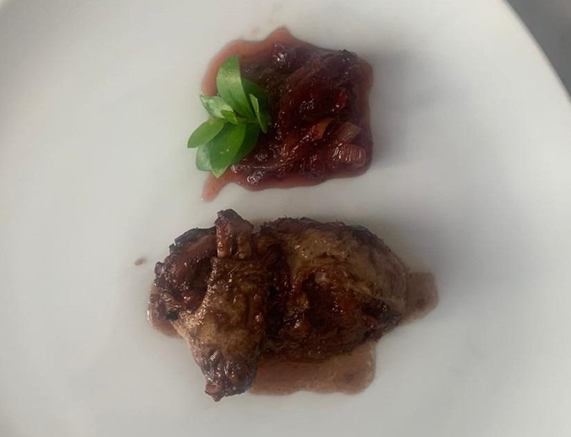 Then the bird is stuffed wiht sausage and with its own organs previously chopped, then sewn; it is roasted in butter, then stewed in wine, honey, vinegar. It is served with an onion jam… handmade by Susan while the pigeon is cooking.