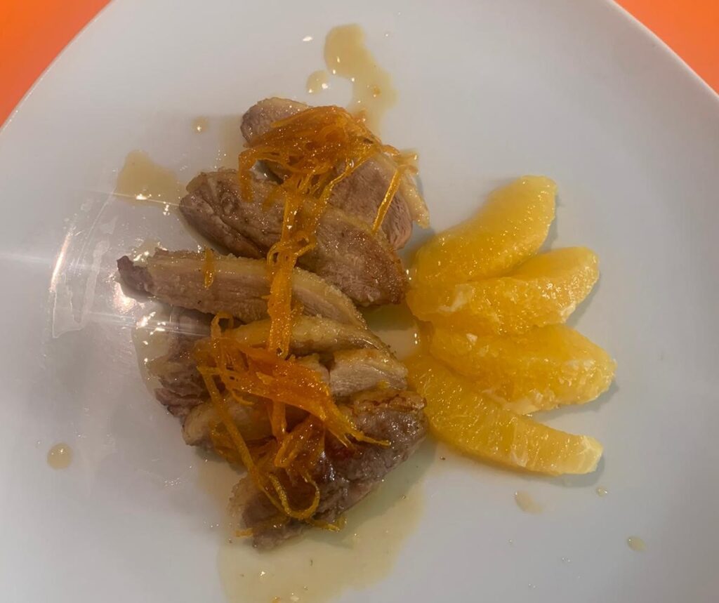 Meanwhile we take out the duck breast from the oven and collect the fat. We prepare a sugar caramel and with it we create a sauce with orange and duck fat to serve with the fanned breast.