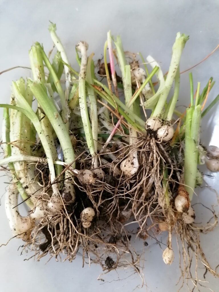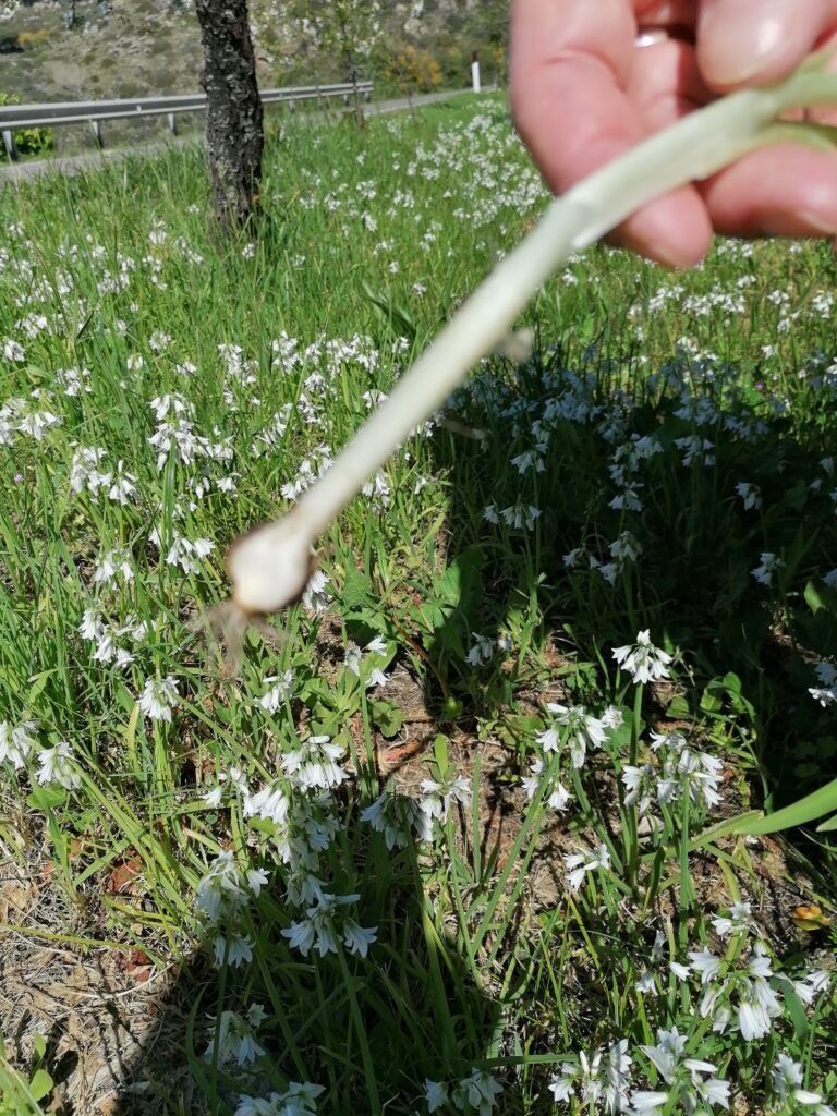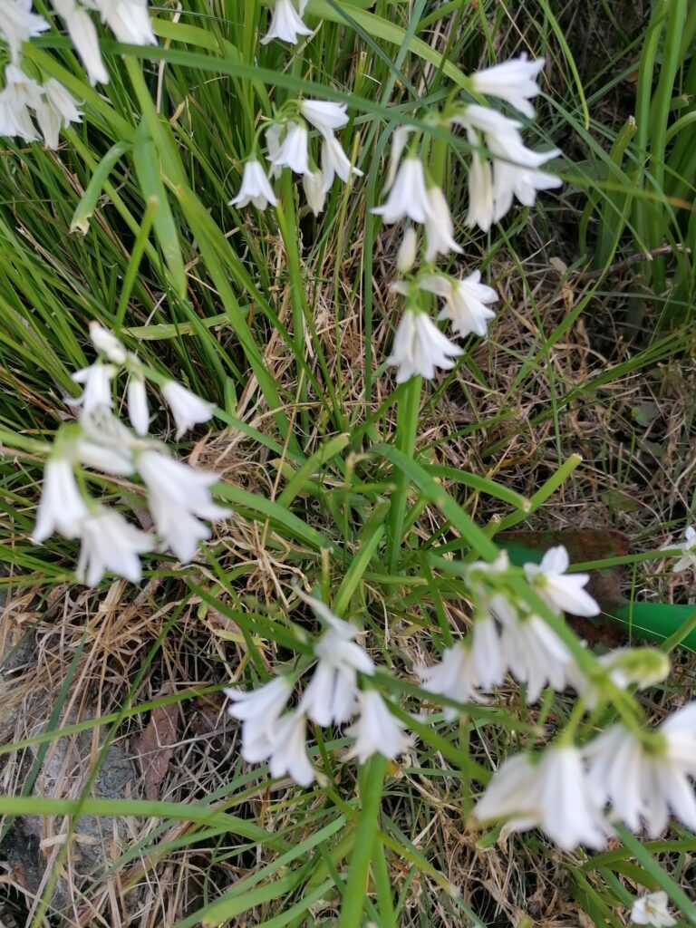 These white bell-flower have a spicy strong smell; at their root there is a small watery bulb. Rather than picking, I had to dig and pull the plant out.