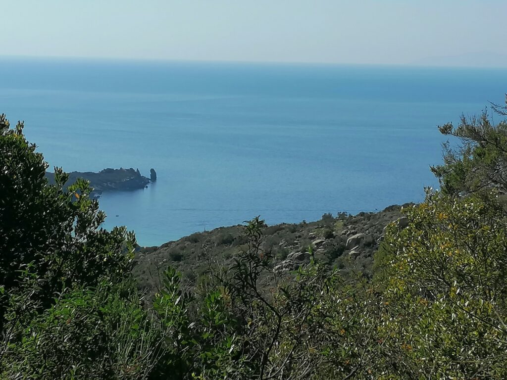 The cover photo shows part of the western side of the island, with Montecristo on the horizon. It is evident in this photo, the valley that divides two hills that almost “splits” the territory, like a small canyon.