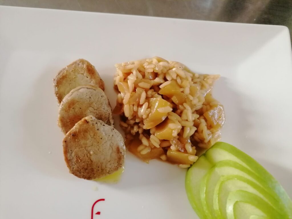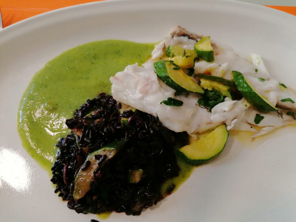 We cooked a Venus risotto with zucchini cream and sea bream fillet.