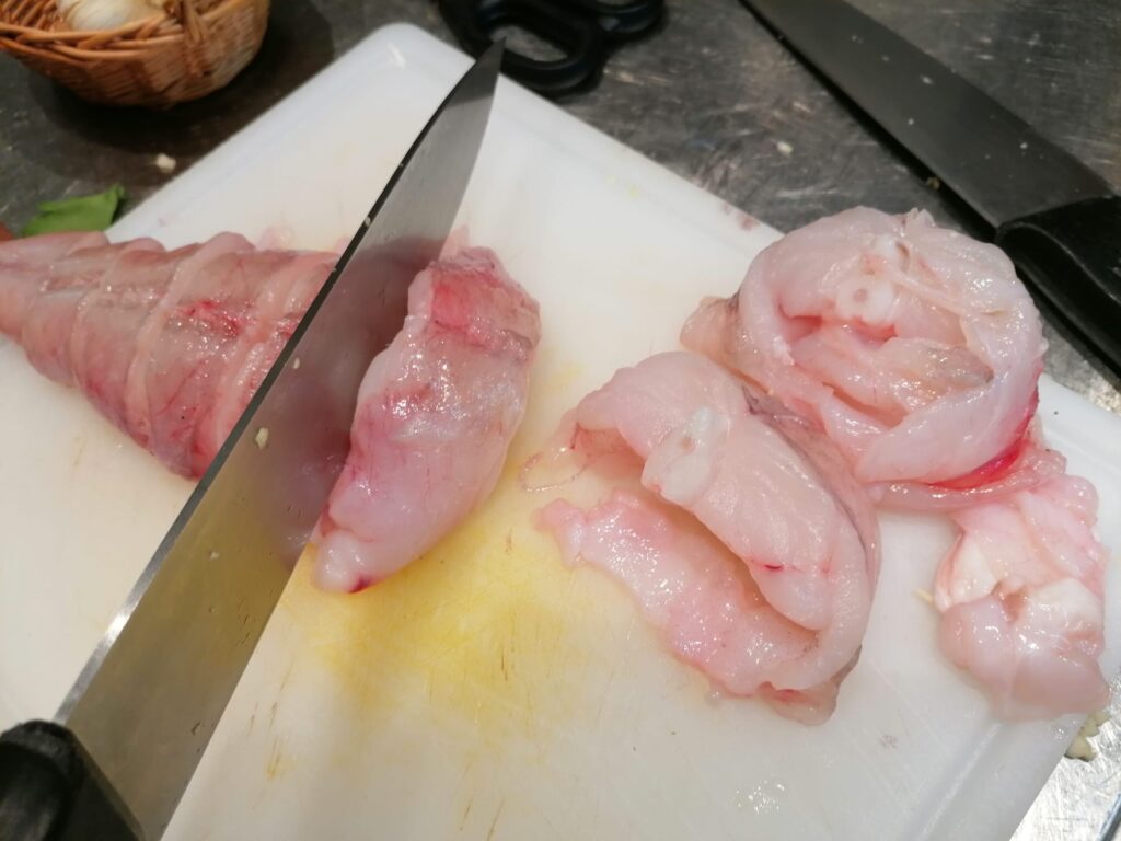 We cut the monkfish into slices a couple of centimeters high.