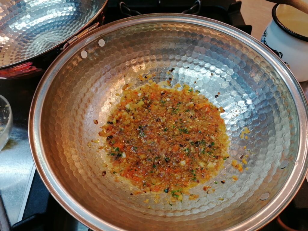 Finely chop the carrot, garlic, onion and celery and sauté them in olive oil together with the hot pepper. Then add the garlic and parsley