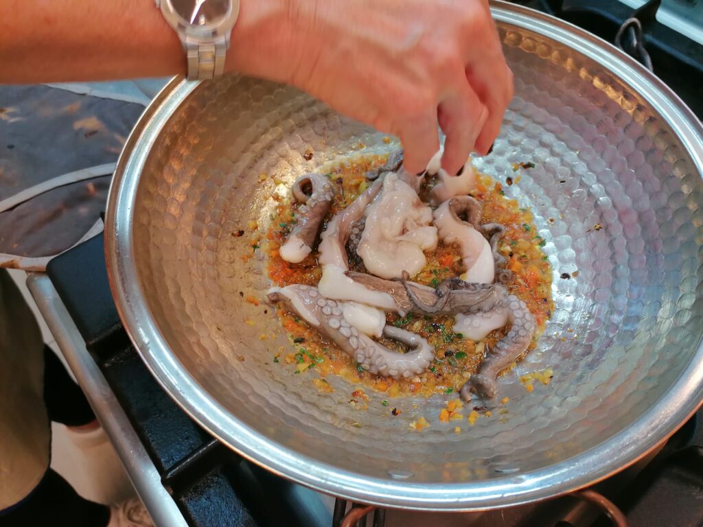Add the octopus. Let its water evaporate then pour the wine. When the wine has completely evaporated, add the tomatoes and a pinch of salt.