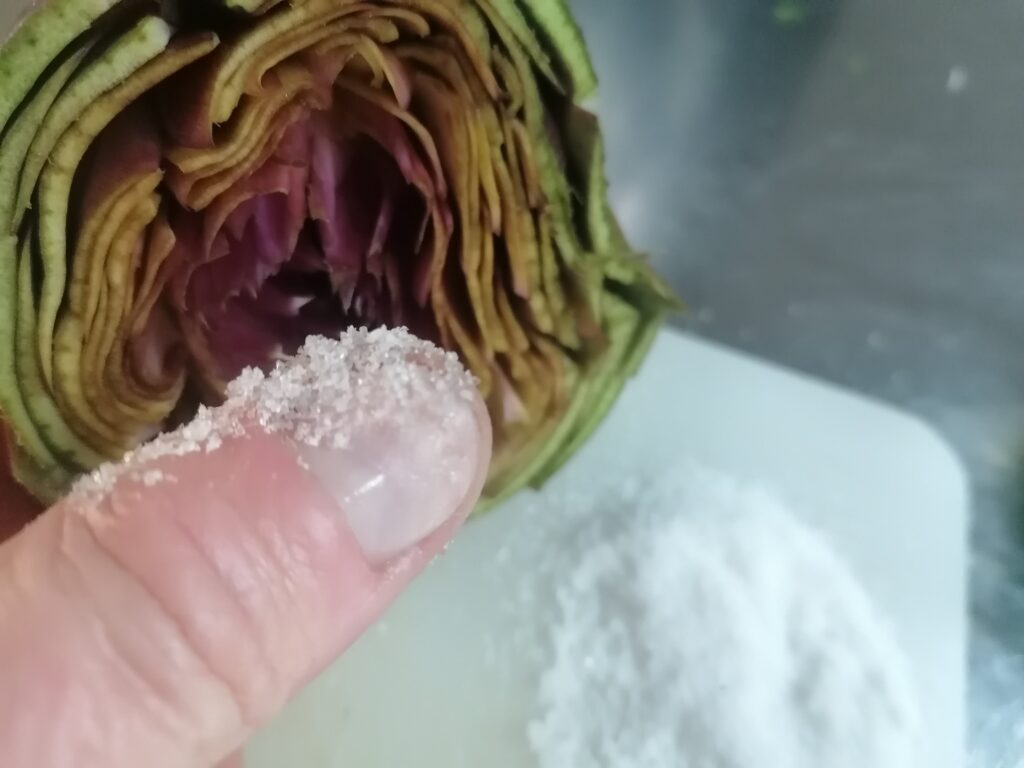 - when stuffing the artichokes with the chopped herbs, rub the inner leaves with the fingertips wet and dipped in fine salt