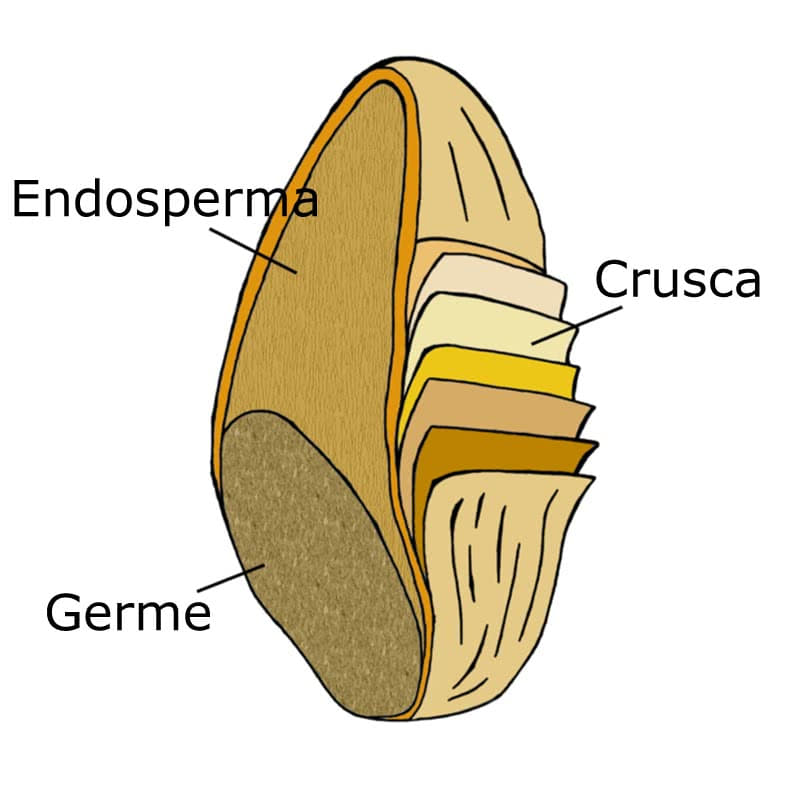 The kernel is formed: by the outer layer, i.e. by the various layers of bran and glume, which vary according to the variety of the grain; inside there are the endosperm, which is the largest part, and the germ, which is the darkest part, the matrix of the new plant.