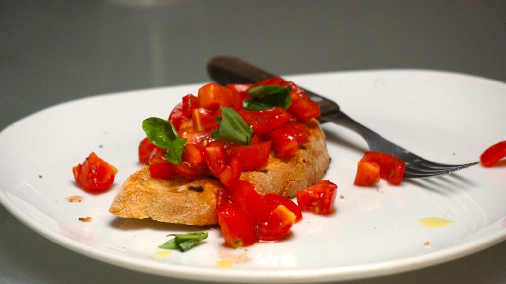 Let’s allow ourselves the luxury of eating bruschetta in bites; we can use the fork to collect the tomato pieces that fall. Enjoyment is guaranteed!